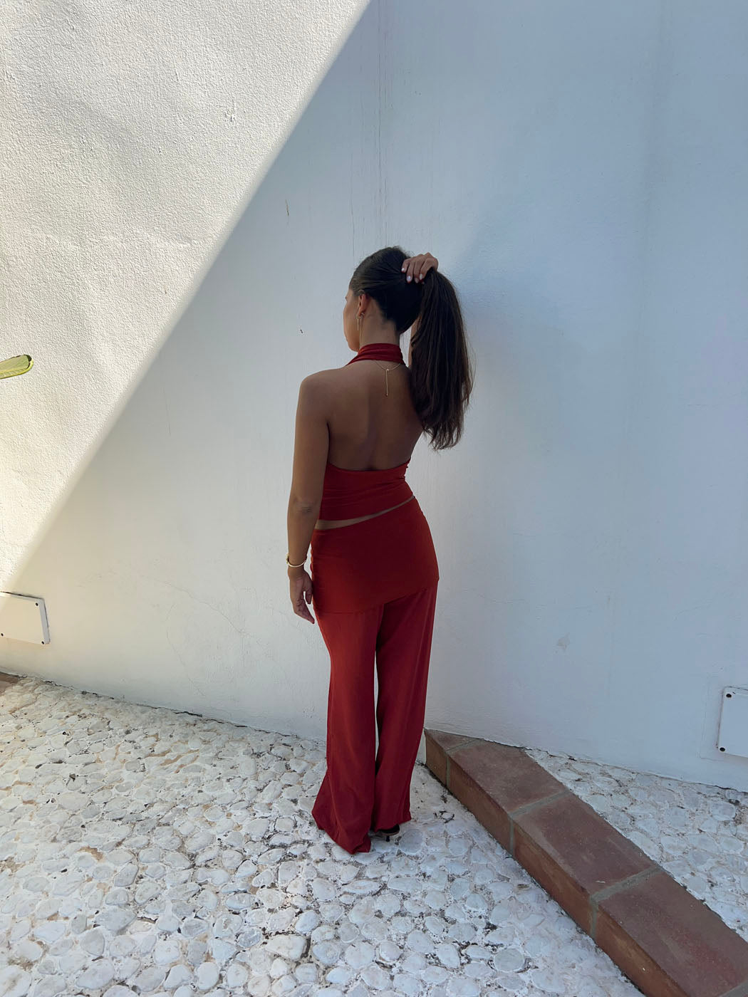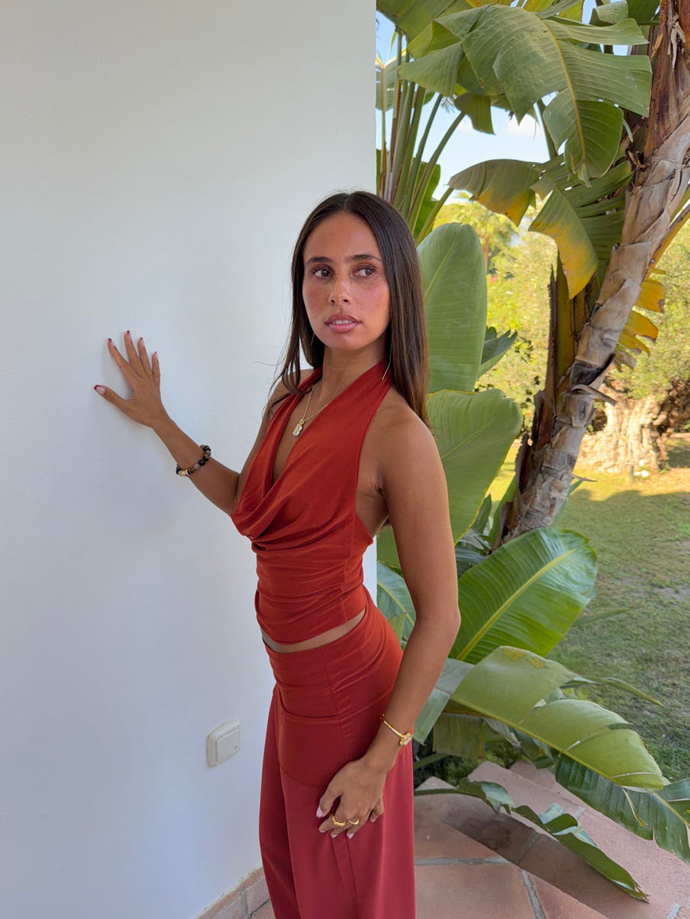 Denne røde halterneck-top kombinerer et elegant snit med et varmt, iøjnefaldende udtryk. Den bløde, lette kvalitet falder flot og føles behagelig mod huden, mens den åbne hals og enkle silhuet skaber et sofistikeret, feminint look.