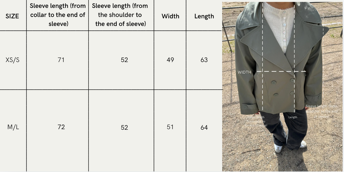 Denne jakke har en kort og løs pasform. Jakken har brede reverser og 2 store lommer i siderne. Den har en knappelukning foran og har de fineste ærmer med en strop- og knappedeltalje ved enden.