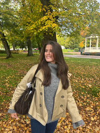 Denne jakke har en løs pasform. Jakken har brede reverser og 2 store lommer i siderne. Den har en knappelukning foran og har de fineste ærmer med en strop- og knappedeltalje ved enden.