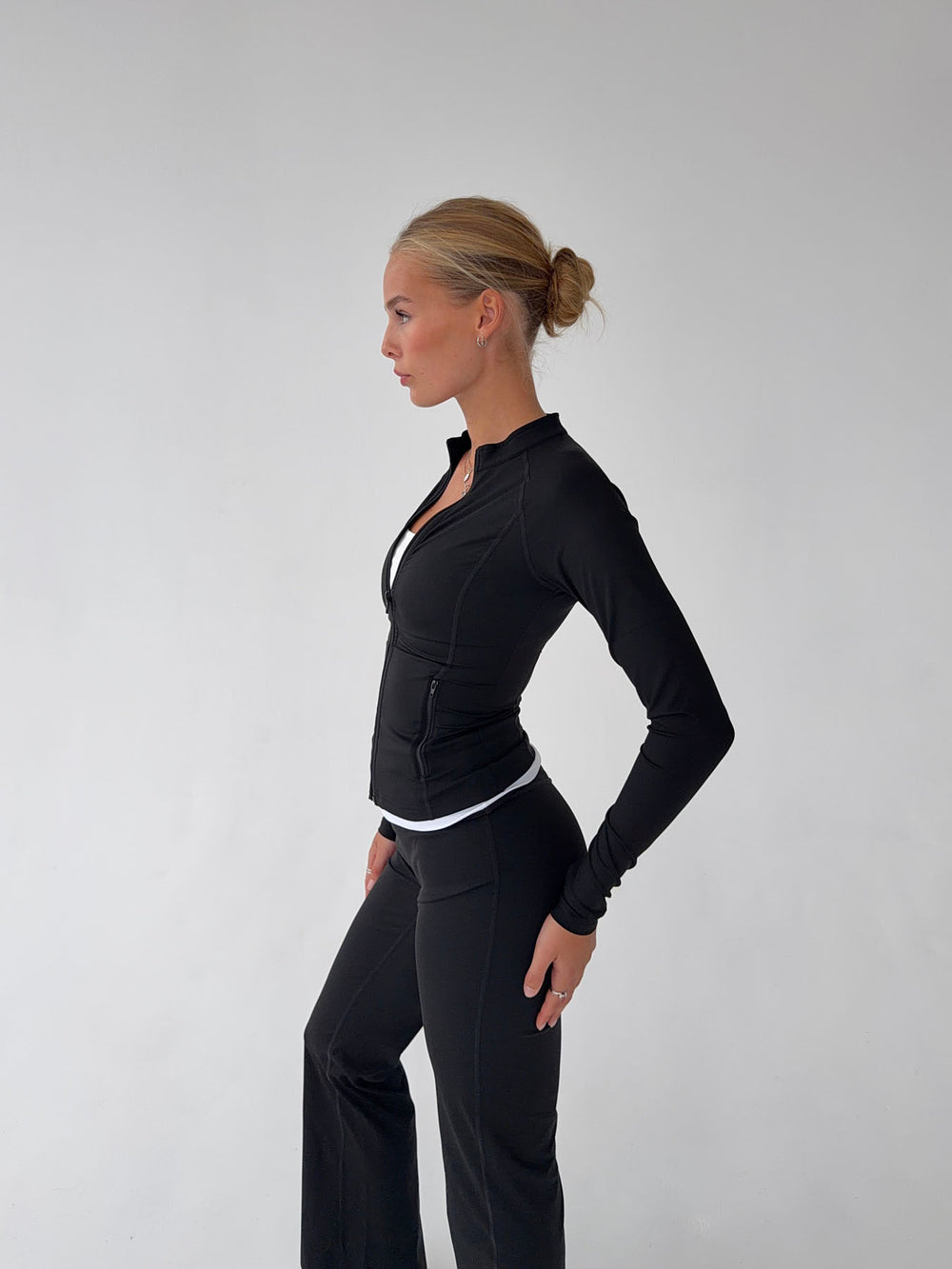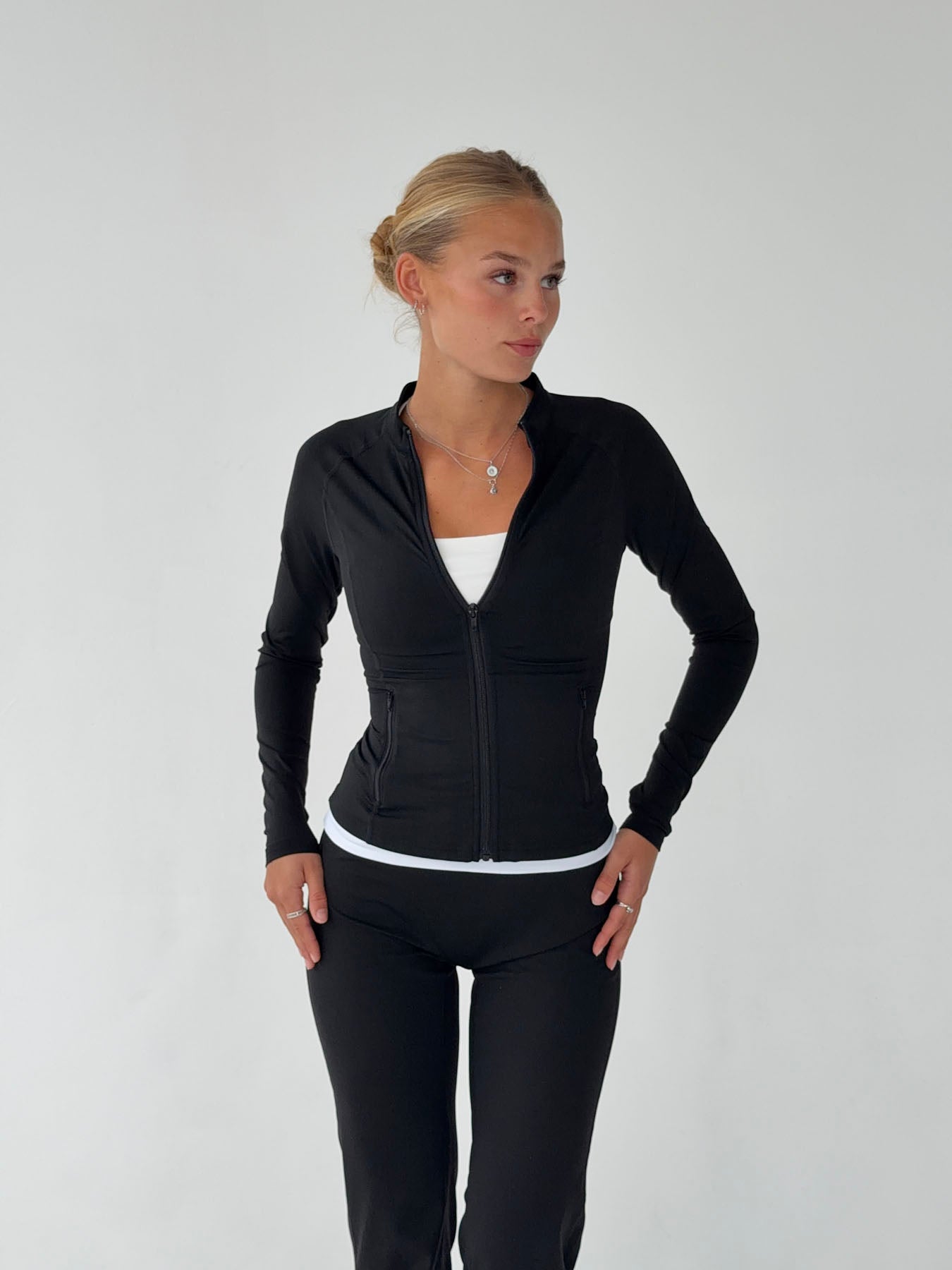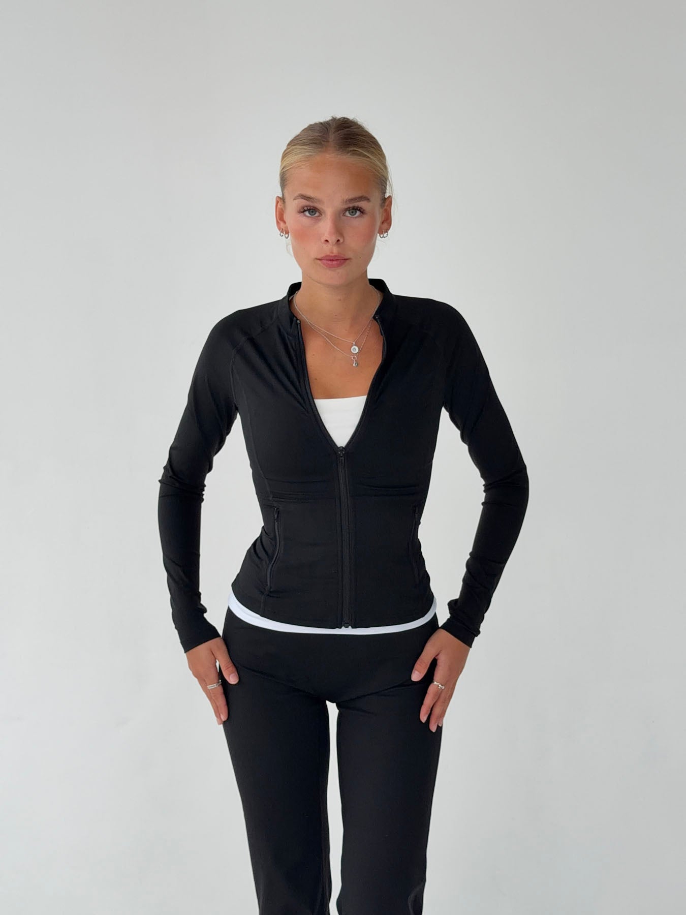 Denne figursyede træningsjakke kombinerer funktionalitet og stil i ét elegant design. Den glatte, elastiske kvalitet former sig smukt efter kroppen og giver fuld bevægelsesfrihed, mens den høje hals og fulde lynlås tilfører et sporty og moderne udtryk. De diskrete syninger og skrå lynlåslommer understreger den feminine pasform og gør jakken både praktisk og flatterende. Perfekt som et let lag til træning, gåture eller afslappede hverdagslooks. Et tidløst og alsidigt stykke, der forener komfort med minimalistisk elegance.